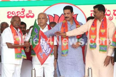 Photo Caption : Karnataka Chief Minister B S Yediyurappa, BJP State President Nalin Kumar Kateel and BJP National Secretary Muralidhar Rao hand over the party flag to disqualified MLA H Vishwanath during a program to induct the disqualified MLAs at BJP office, in Bengaluru on Thursday 14th November 2019