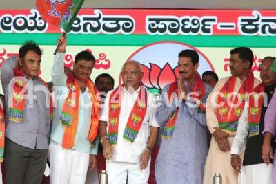 Photo Caption : Karnataka Chief Minister B S Yediyurappa, BJP State President Nalin Kumar Kateel and BJP National Secretary Muralidhar Rao hand over the party flag to disqualified MLA Munirathna during a program to induct the disqualified MLAs at BJP office, in Bengaluru on Thursday 14th November 2019