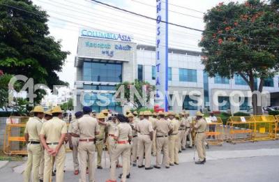 Photo Caption : Tight police security outside the Columbia Asia Hospital in Mysure, as Congress MLA Tanveer Sait is being treated at Columbia Asia Hospital after being stabbed by a unknown person during a wedding, in Mysuru on Monday 18th November 2019