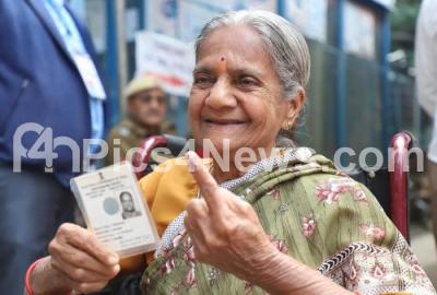 Photo Caption : An elder showing her marked finger at Vrushabavathi Nagar election booth following Mahalakshmi Layout constituency Assembly Bye Election, in Bengaluru on Thursday 5th December 2019