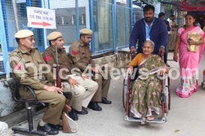 An elderly woman arriving to cast her vote at Vrushabavathi Nagar election booth following Mahalakshmi Layout constituency Assembly Bye Election, in Bengaluru on Thursday 5th December 2019
