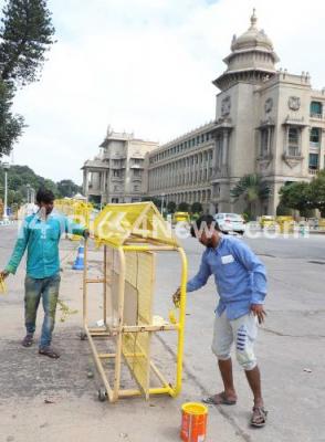 Barricades being painted at Vidhan Soudha