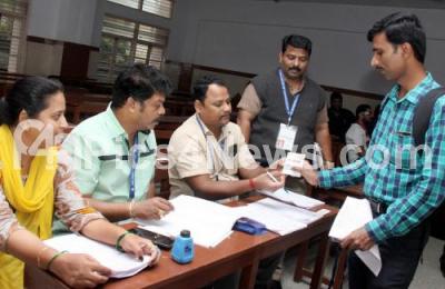 Photo Caption : Counting officers distributing ID cards at Mount Carmel college, Election Counting center for the tomorrow Bye Election results, in Bengaluru on Sunday 8th December 2019