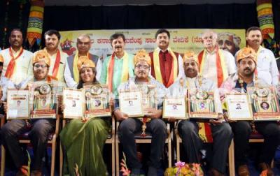Photo Caption : Prof SG Siddaramaiah and Former Minister PGR Sindhya presenting "Kadamba Rathna" award to Rajani Narahalli, Dr. Venkatesh M Rao, B Bharath, Maltesh Janagal, K T Nagaru and P Chandravelu during "Kannada Nudi Sammelana" at Nayana, organised by Akila Karnataka Kuvempu Samskrutika Vedike, in Bengaluru on Sunday 8th December 2019