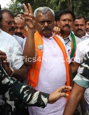 BJP Yeshwanthpura Candidate ST Someshekhar seen flashing the victory sign after winning the Bye Elections at counting centre at RV Engineering College, in Bengaluru on Monday 9th December 2019