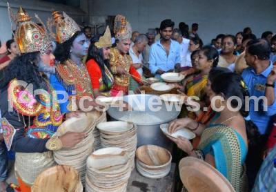 Photo Caption : Devotees dressed in Lord Hanuman attire seen serving food to other devotees on the occasion of Hanuman Jayanti at Patala Anjaneya Swamy Temple, Anand Rao Circle, in Bengaluru on Monday 9th December 2019