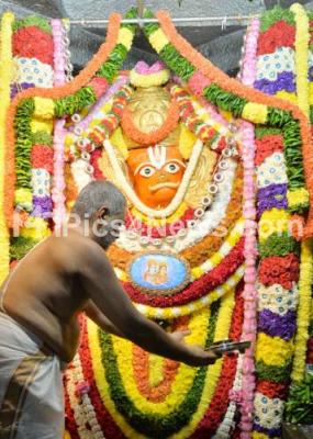 Photo Caption : Priest performing pooja to Lord Hanuman at Gali Anjaneya Temple, Mysore Road, on the occasion of Hanuman Jayanti, in Bengaluru on Monday 9th December 2019
