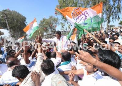 Photo Caption : Congress Hunsur Candidate HP Manjunath with supporters celebrating after winning the Bye Elections, in Hunsur on Monday 9th December 2019