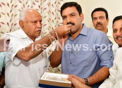 Photo Caption : Chief Minister of Karnataka, BS Yediyurappa serving sweet to his son BY Vijayendra after BJP won 12 out of 15 assembly constituency bye election, in Bengaluru on Monday 9th December 2019