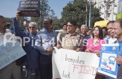 Photo Caption : A unique awareness Nimbus express bus yatra campaign was organised by citizens, civic groups, such as Citizens For Bengaluru (CfB), Bus Prayanikara Vedike, Whitefield Rising and Bellandur Jothege and was attended by Bhaskar Rao, Bengaluru City Police Commissioner and others to promote the Bus Priority Lane Project at Silk Board, in Bengaluru on Wednesday 11th December 2019