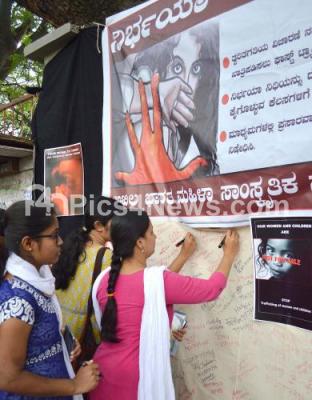 Members of AIMSS organised signature campaign at SBM Circle to protest against atrocity on women, in Bengaluru on Monday 16th December 2019