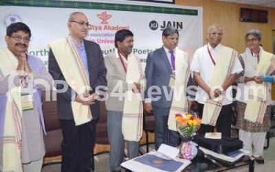 Photo Caption : K Sreenivasarao Secretary Sahitya Academy Sirpi Balasubramanaiam Convener Tamil Advisory Board Sahitya Academy Siddalingaiah Convener Kannada Advisory Board Sahitya Academy during "North - East and Southern Poet Meet" at Jain University in Bengaluru on Saturday 28th December 2019