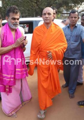 Photo Caption : Sri Nirmalananda Swamji arriving at National College Grounds to pay his last respect to Sri Vishwesha Theertha Swamiji of Pejawar Mutt, who passed away today at a private hospital, in Udupi , his remains were bought to National College Grounds for public viewing, in Bengaluru on Sunday 29th December 2019