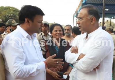 Photo Caption : KPCC President Dinesh Gundurao and Mayor Gautham Kumar arriving at National College Grounds to pay their last respect to Sri Vishwesha Theertha Swamiji of Pejawar Mutt, who passed away today at a private hospital, in Udupi , his remains were bought to National College Grounds for public viewing, in Bengaluru on Sunday 29th December 2019
