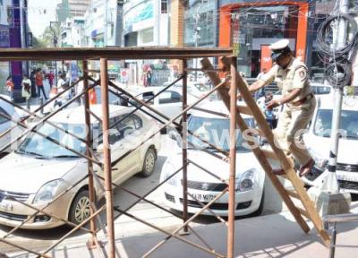 Photo Caption : Police security stands which is installed at Brigade Road for the security for new year celebrations in Bengaluru on Monday 30th December 2019