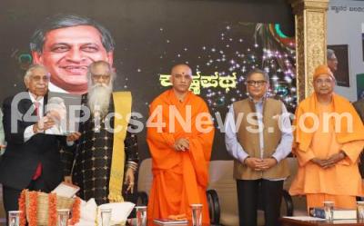 Photo Caption : Sri Nirmalananda Swamiji of Adichunchanagiri Mutt releasing the "Krishna Patha" book on Former Union Minister SM Krishna with Muktidananda Maharaj, Justice M N Venkatachalaiah and others at Jnana Jyothi Auditorium in Bengaluru on Saturday 4th January 2020