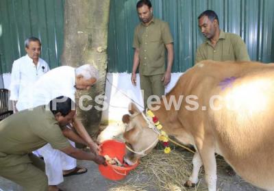 Photo Caption : Governor of Karnataka Vajubhai Vala performing pooja to the cows at Raj Bhavan on the occasion of Sankranthi festival, in Bengaluru on Wednesday 15th January 2020