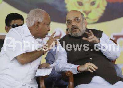 Union Home Minister Amit Shah in discussion with CM BS Yediyurappa during the Vedanta Bharati “Viveka Deepini Mahasamarpane” event at Sri Krishnavihar, Palace Ground, in Bengaluru on Saturday 18th January 2020