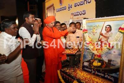Photo Caption : Sri Shanthabhishma Chowdaiah Mahaswamy with S Rangappa, Director for Kannada and Culture and others paid floral tribute to Sri Ambigara Chowdaiah during the Sri Ambigara Chowdaiah Jayanti program at Ravindra Kalakshetra, in Bengaluru on Tuesday 21st January 2020