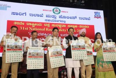 Photo Caption : Bhaskar Rao, Benagluru City Police Commissioner with MLA Uday Garudachar, Dr BR Ravikanthe Gowda, Additional Commissioner of Police (Traffic), Actress Aditi Prabhudeva and others releasing the calendar and table calendar of 2020 year during the valedictory program of 31st National Road Safety week at Town Hall, in Bengaluru on Tuesday 21st January 2020