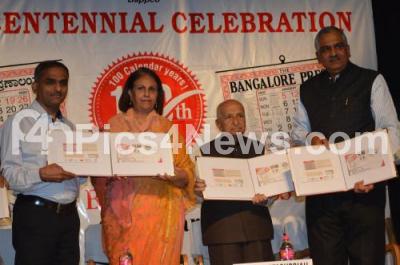 Photo Caption : Dr Pramoda Devi Wadiyar, Scion of the Mysore Royal Dynasty with Prof G Venkatasubbaiah, Dr Charles Lobo, Chief Master General Karnataka, HN Suresh and HR Ananth, MD The Bangalore Press, releasing the special postal cover of the Bangalore Press Calendars during the centennial celebration at Bharatiya Vidya Bhavan, in Bengaluru on Monday 27th January 2020