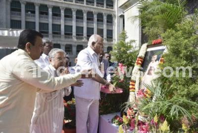 Photo Caption : Chief Minister of Karnataka BS Yediyurappa with DCM Govind Karjol and Minister CC Patil paying homage to Mahatma Gandhi to commemorate Martyrs Day, death anniversary of Mahatma Gandhi at Vidhana Soudha, in Bengaluru on Thursday 30th January 2020