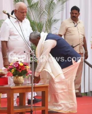 Photo Caption : Newly inducted Minister ST Somashekar (Yeshwantpur constituency) seeking blessings from Chief Minister of Karnataka B S Yediyurappa during newly inducted Ministers swearing ceremony at Raj Bhavan, in Bengaluru on Thursday 6th February 2020