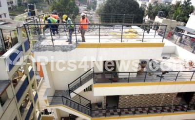 Photo Caption : Workers demolishing the 5 storey tilted building due to the construction of another building next door at Kempapura, Byatrayanapura Ward, in Bengaluru on Thursday 6th February 2020