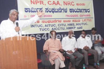 Photo Caption : Senior Advocate Baapu Heddur Shetty with Kalappa, General Secretary, HMKP State Committee, Gopala Gowda, CITU State Committee, Shamanna Reddy, INTUC and Appanna AICCTU during seminar on CAA.and NRC for Workers Association members at a program organised by Joint Committee of Workers Association at Gandhi Bhavan, in Bengaluru on Sunday 9th February 2020