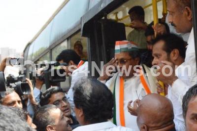 Photo Caption : Congress Leaders Siddaramaiah, Dinesh Gundu Rao, Narayan Swamy and workers detained by Police during their protest against State Govt for misusing Police Dept, the protest held near Gandhi Statue, Anand Rao Circle, in Bengaluru on Saturday 15th February 2020