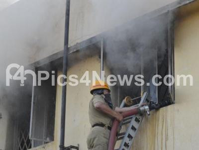 Firemen dosing the fire, which had caught in an office at Unity Building, Sampangi Rama Nagar, near JC Road, in Bengaluru on Saturday 15th February 2020