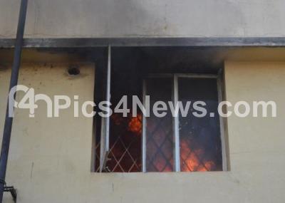 Photo Caption : Firemen dosing the fire, which had caught in an office at Unity Building, Sampangi Rama Nagar, near JC Road, in Bengaluru on Saturday 15th February 2020