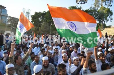 Photo Caption : Participants wave Indian flags during the protest meeting against CAA, NRC and NPR at Freedom Park, the protest meeting was organised by Hindu Muslim Sikh Isaai Federation, in Bengaluru on Thursday 20th February 2020