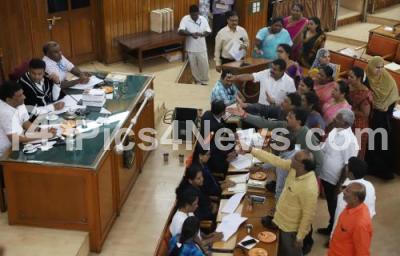 Photo Caption : Opposition Congress councilors staged a protest against the statements made my BJP Councilor Umesh Shetty on Mayor during the BBMP Council Session at BBMP Head Office, in Bengaluru on Saturday 29th February 2020