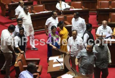 Photo Caption : Opposition council members protesting against Basanagouda Patil Yatnal, BJP MLA from Vijayapura, for his remarks on HS Doreswamy, Freedom Fighter, during the Council Session at Vidhan Soudha, in Bengaluru on Monday 2nd March 2020