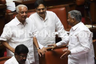 Photo Caption : Minister V Somanna seen with MLC Prakash Rathod and Allam Veerabhadrappa during the Council Session at Vidhan Soudha, in Bengaluru on Wednesday 4th March 2020