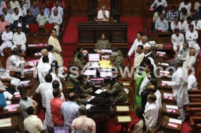 Congress and JDS MLCs staging a protest against remarks made by MLC Ravikumar on HS Doreswamy, Freedom Fighter during the Council Session at Vidhan Soudha, in Bengaluru on Wednesday 4th March 2020