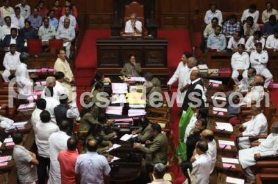 Photo Caption : Congress and JDS MLCs staging a protest against remarks made by MLC Ravikumar on HS Doreswamy, Freedom Fighter during the Council Session at Vidhan Soudha, in Bengaluru on Wednesday 4th March 2020