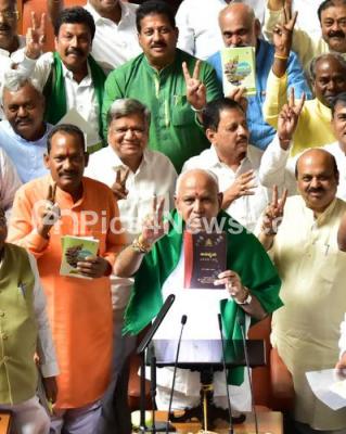 Photo Caption : CM BS Yediyurappa seen with ruling party Ministers and MLAs after presenting the budget 2020 session at Vidhana Soudha, in Bengaluru on Thursday 5th March 2020