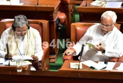 Photo Caption : Former CM Siddaramaiah seen with MLA RV Deshpande at the budget 2020 session at Vidhana Soudha, in Bengaluru on Thursday 5th March 2020