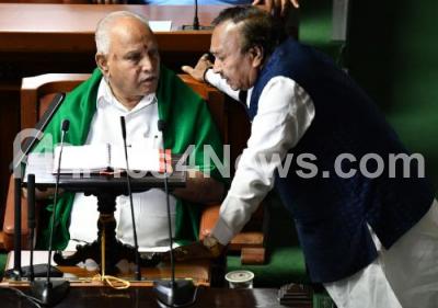 Photo Caption : CM BS Yediyurappa interacting with Minister KS Eshwarappa during the budget 2020 session at Vidhana Soudha, in Bengaluru on Thursday 5th March 2020