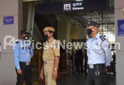 Photo Caption : Metro security personnel seen using protective masks as a precautionary measure, in Bengaluru on Thursday 5th March 2020