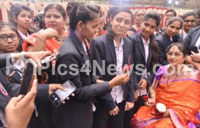 Photo Caption : Senior Actress Bharati Vishnuvardan being greeted by students during International Women Day celebration program at BBMP, in Bengaluru on Saturday 7thMarch 2020