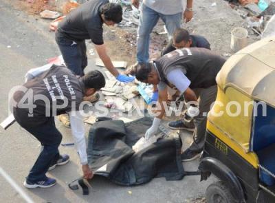 Photo Caption : Police Bomb Detection and Disposal Squad seen at the spot where a 50 year old ragpicker lost his leg in a minor explosion of an abandoned chemical liquid container at a garbage heap in Adugodi area, in Bengaluru on Sunday 8th March 2020