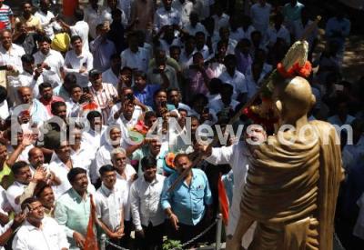 Photo Caption : KPCC President Designated DK Shivakumar garlanding Mahatma Gandhi Statue during a meeting at Congress Bhavan, Race Course Road, in Bengaluru on Monday 16th March 2020