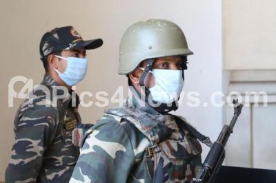 Army security personnel wearing protective masks for Coronavirus at the entrance of Vidhan Soudha, in Bengaluru on Wednesday 18th March 2020