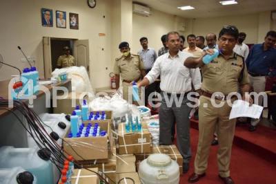 Photo Caption : Bengaluru City Police Commissioner Bhaskar Rao checks the duplicate and illegal sanitizers worth 56 Laksh, seized from a factory, being displayed during a press conference, in Bengaluru on Friday 20th March 2020