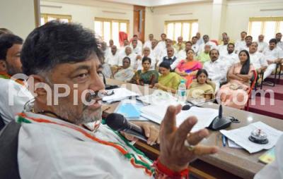 Photo Caption : KPCC Designated President DK Shivakumar with Designated Working Presidents Satish Jarakiholi, Saleem Ahamed and Eshwar Khandre seen during a meeting at KPCC, in Bengaluru on Friday 20th March 2020