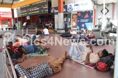 Photo Caption : Passengers stranded at Bengaluru City Railway Station, as people observe self imposed Janata Curfew amid rising Coronavirus cases, in Bengaluru on Sunday 22nd March 2020