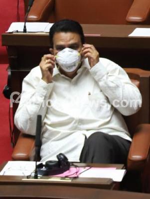 Photo Caption : Minister CC Patil seen wearing protective mask at the Council Session at Vidhan Soudha, in Bengaluru on Monday 23rd March 2020